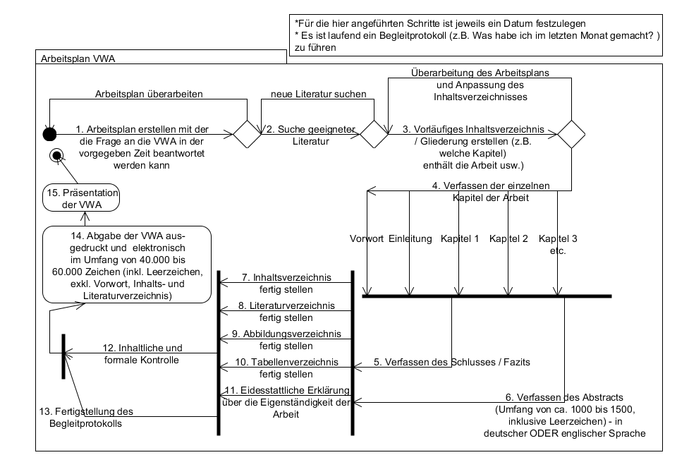| September | 4. Woche | * Studium der Mindmap “VWA / Diplomarbeit erste Schritte” * Abgabe Checkliste Textverarbeitung! * Abgabe Checkliste Formale Kriterien! * Zusendung des „Begleitprotokolls für die Erstellung einer Vorwissenschaftlichen Arbeit“ an die E-Mail-Adresse des Betreuers |