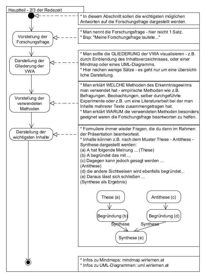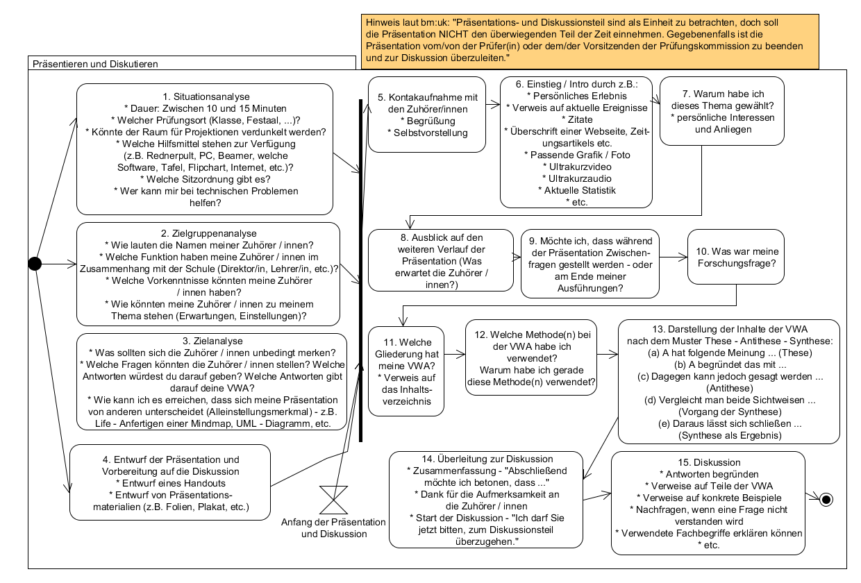 | Februar | 4. Woche | * Studium der Mindmap “Präsentieren und Diskutieren” * Zusendung des „Begleitprotokolls für die Erstellung einer Vorwissenschaftlichen Arbeit“ an die E-Mail-Adresse des Betreuers |